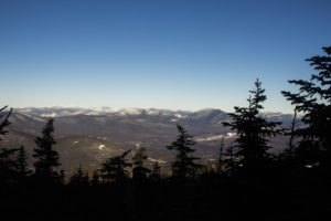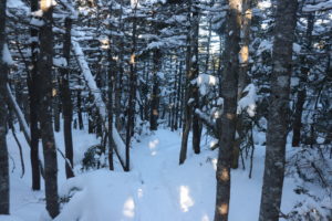 I started my way up Dicey’s mill trail all the way up to the summit of Passconaway. While I was hiking up I was surrounded by pitch black all around me and the stars from the sky shining down on me. A ways in I startled a large animal, I was not able to figure out what it was. As the sun started to rise I was greeted by the red aura that came from the sunrise. As I approached the summit the temperature was still a comfortable 5 degrees. The first vista provided a wonderful of the mountains towards the northwest. I took a quick break and chowed down on some trail snacks. I began my way back down to the trail junction of Dicey’s mill trail and Rollins Trail. The trail looked like it had received very little use since the past snow fall as it was lightly broken, perhaps by 2 hikers. I continued walking through the snow covered forest treading carefully as the snow pack was hard on top and soft underneath.