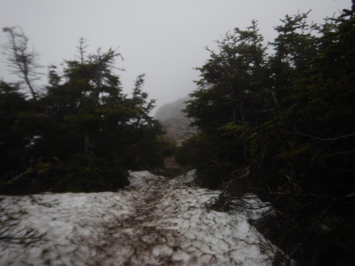 Adventure was calling once again, this time it was calling for the White mountains. I had set this adventure on a particular hike that was a very popular hike with tremendous views. Knowing that it could be very busy  I decided to take my chances in the shoulder season. Being May, some snow still remained. Most of the snow would be rotten/ unstable while the solid snow would be in the very middle almost like a mono rail. I drove up after a  working a full day at work. I had arrived at the trail head very late and would be hiking and setting up in the dark which was expected.. It was raining and just hot enough that you were comfortably uncomfortable. I was making good time and before I knew it I had hit the elevation gain. By now it was raining and i was pretty uncomfortable. Being dark and probably the only one on the trail, I proceeded to taking my shirt off and hiking with just a poncho and my shorts on. A huge sense of relief soon came as the breeze cooled me off. After 2 small stream crossings I soon made it to liberty springs camp site. I was the only one there as I navigated my way through the blow down and empty campsite. This was before I had my tent, so I had brought with my 4 season bivy and a tarp.