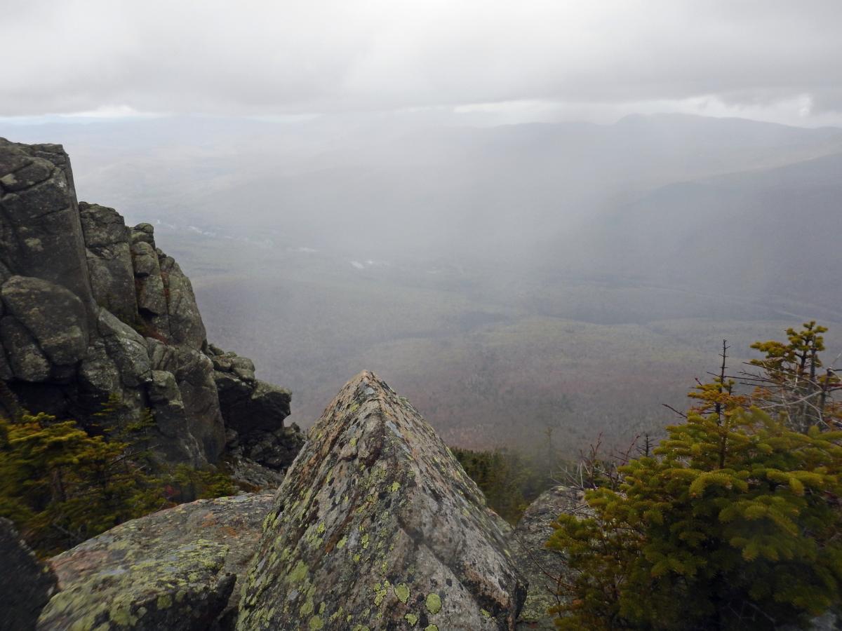 I soon made it to  Lincoln, I quietly rejoiced as I could not see a thing but being trapped in the clouds was such a mystical feeling. While enjoying this feeling I was interrupted by the sudden increase in wind and now rain. I donned my rain gear and pushed on towards Mt Lafayette. The wind was getting heavier and the wind was getting fierce as I was pushing on. I was starting to get a slight chill as I could see Lafayette in the heart of the mist provided by the clouds. As I pushed onward the wind got more forceful and the rain got heavier as I approached the summit. The final push was the most memorable because , as I was looking for the summit marker I climbed over the ledge and got hit by a surge of wind and rain right in my face.  At 5,000+ Feet I could only see rain and clouds around me. After enjoying the clouds views I worked my way back to the junction to Liberty springs.  Even though my body was tired and I was running on fumes I decided to make the half mile push up to liberty. Every step I made felt like lead weight in my legs. I was running on fumes but step by step I pushed onward. The last  led to a view of the clouds starting to break. For  what seemed like for ages I was now seeing through the clouds. I sat here for a bit and enjoyed  view for a bit.