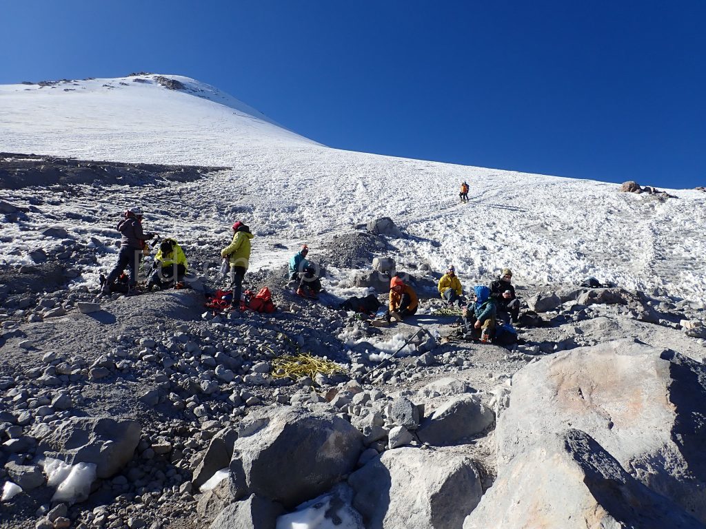 We finally made to the shelter extremely late. I wish I remembered how late we got there. All I remember is laying down flat for 3 hours and then getting up with maybe only 30 minutes of actual sleep. Now the fun part of waking up was hoping that the monster drink that I had brought up was not going to explode at 14k feet. We all woke up, got ready and shoveled down some food as to get ready for our hard time start. Monster, Diamox, and garlic, and snacks. I’ve had weirder combinations.